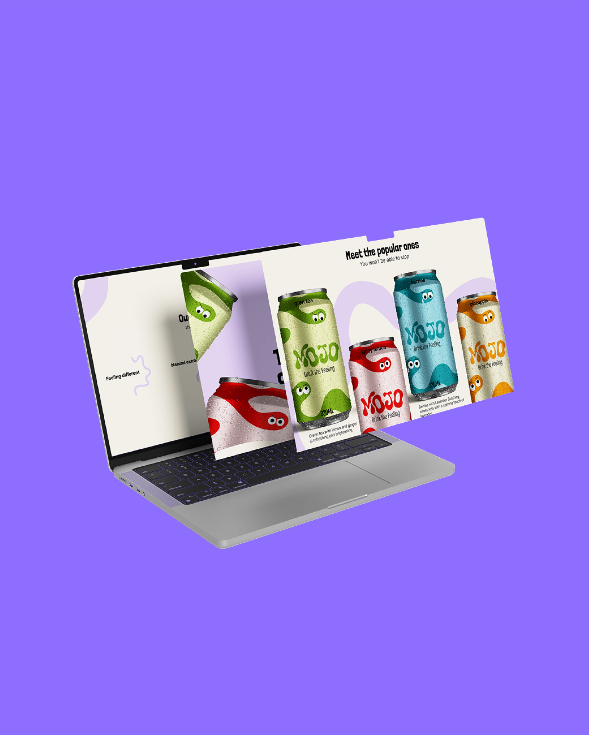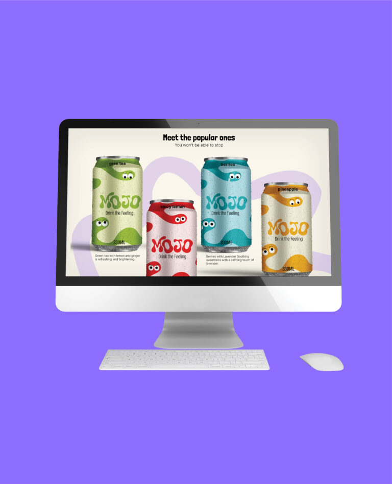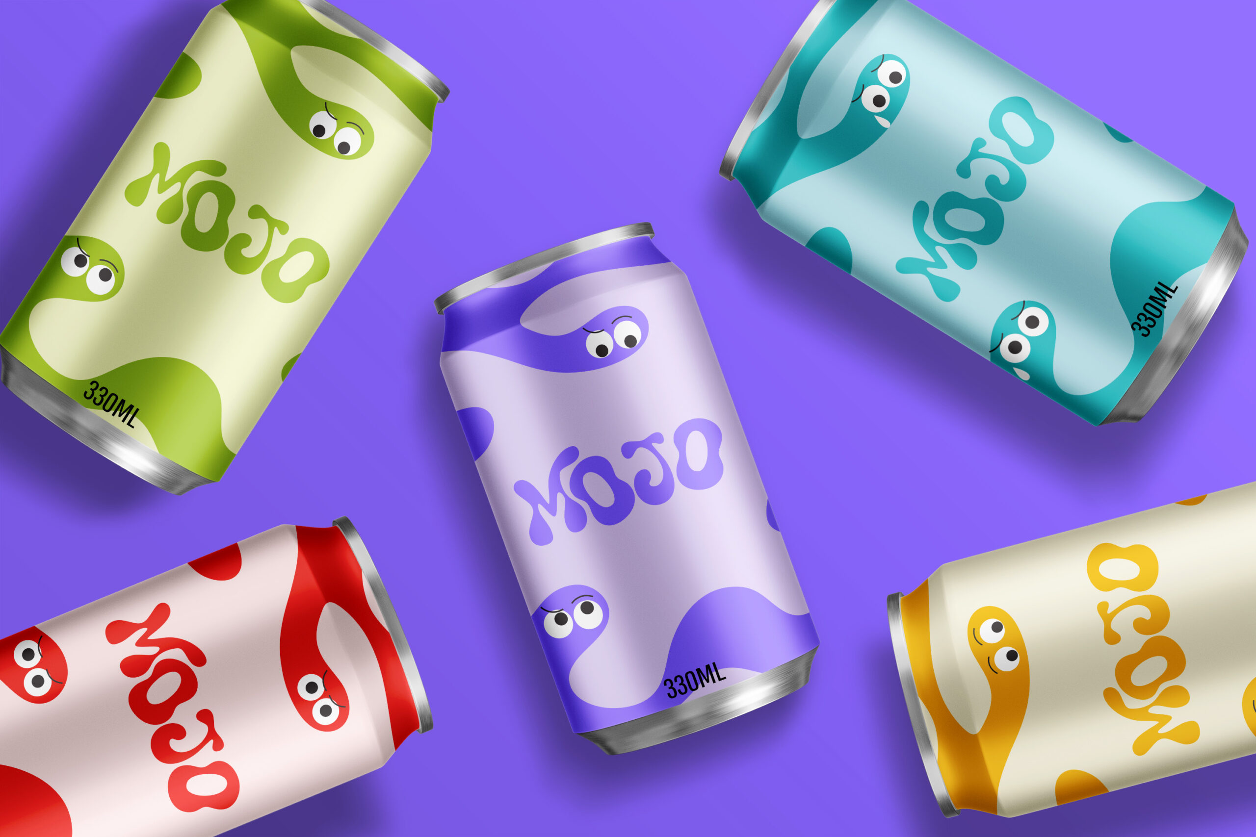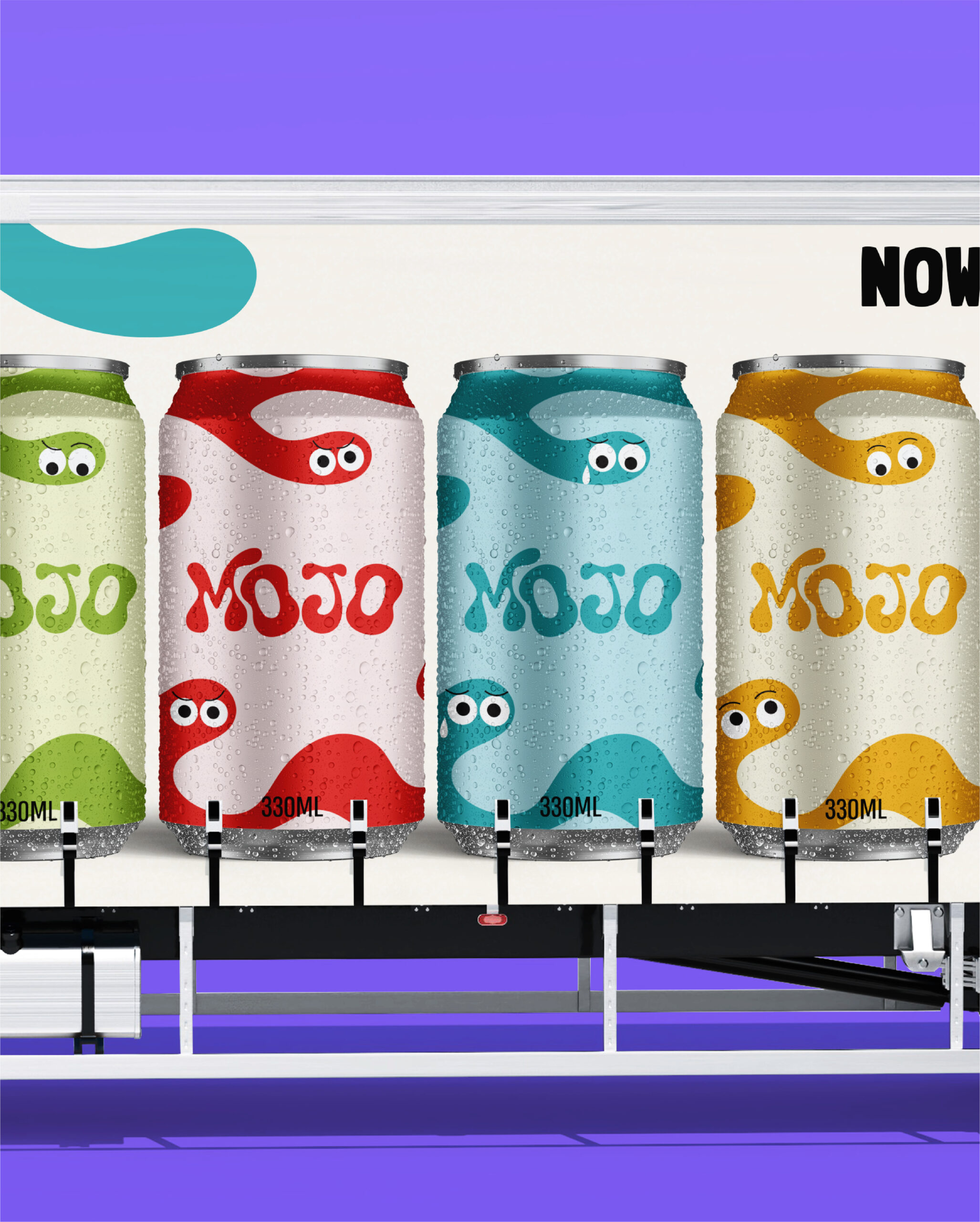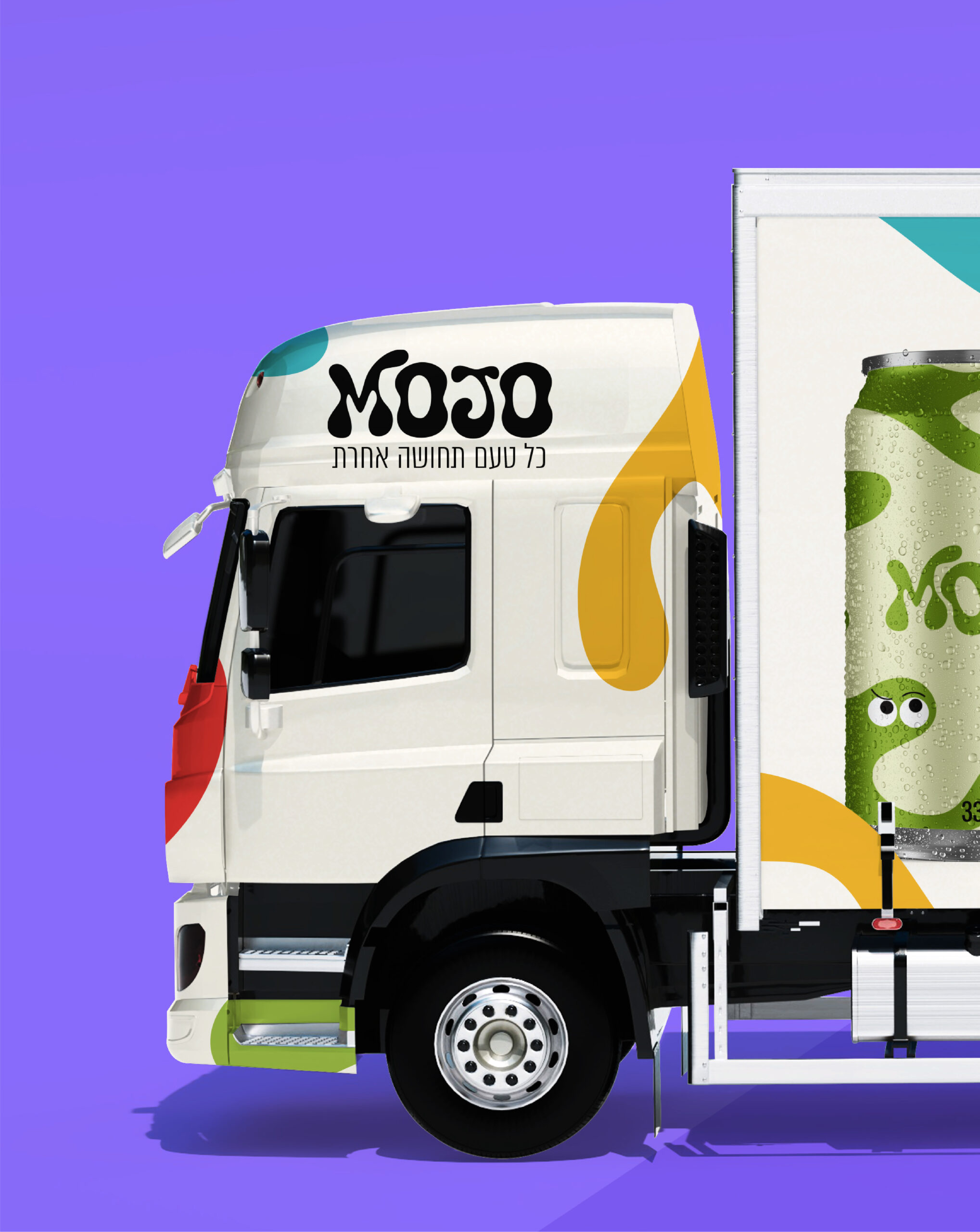 המותג MOJO משדר אנרגיה, שמחה ותנועה. הצבעים הבולטים, הצורות הזורמות והדמויות עם העיניים יוצרים שפה גרפית חיה ואחידה – מהלוגו ועד המשאית. כל מוצר מעביר תחושה אחרת, כחוויה אחת שמרימה את מצב הרוח.