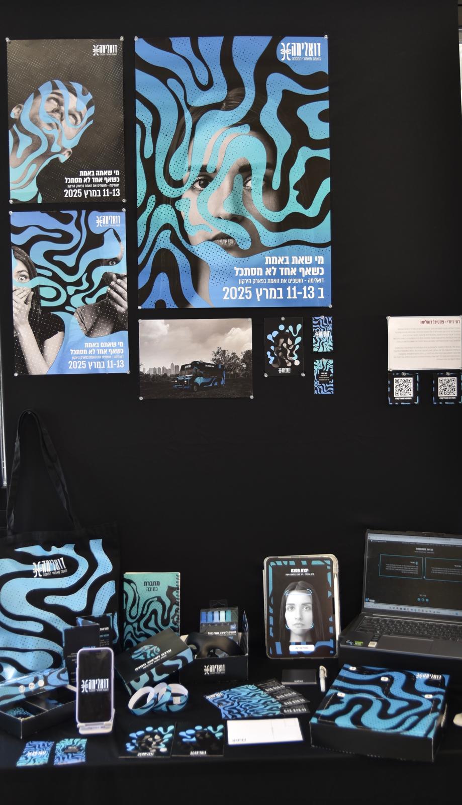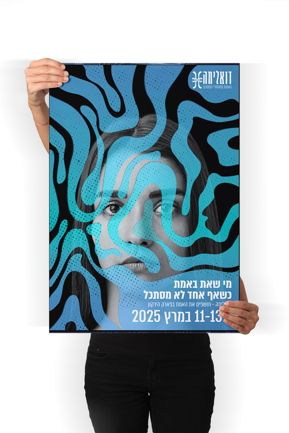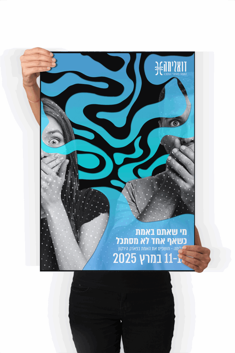 השפה הגרפית מבטאת דואליות, תנועה וחיפוש עצמי.