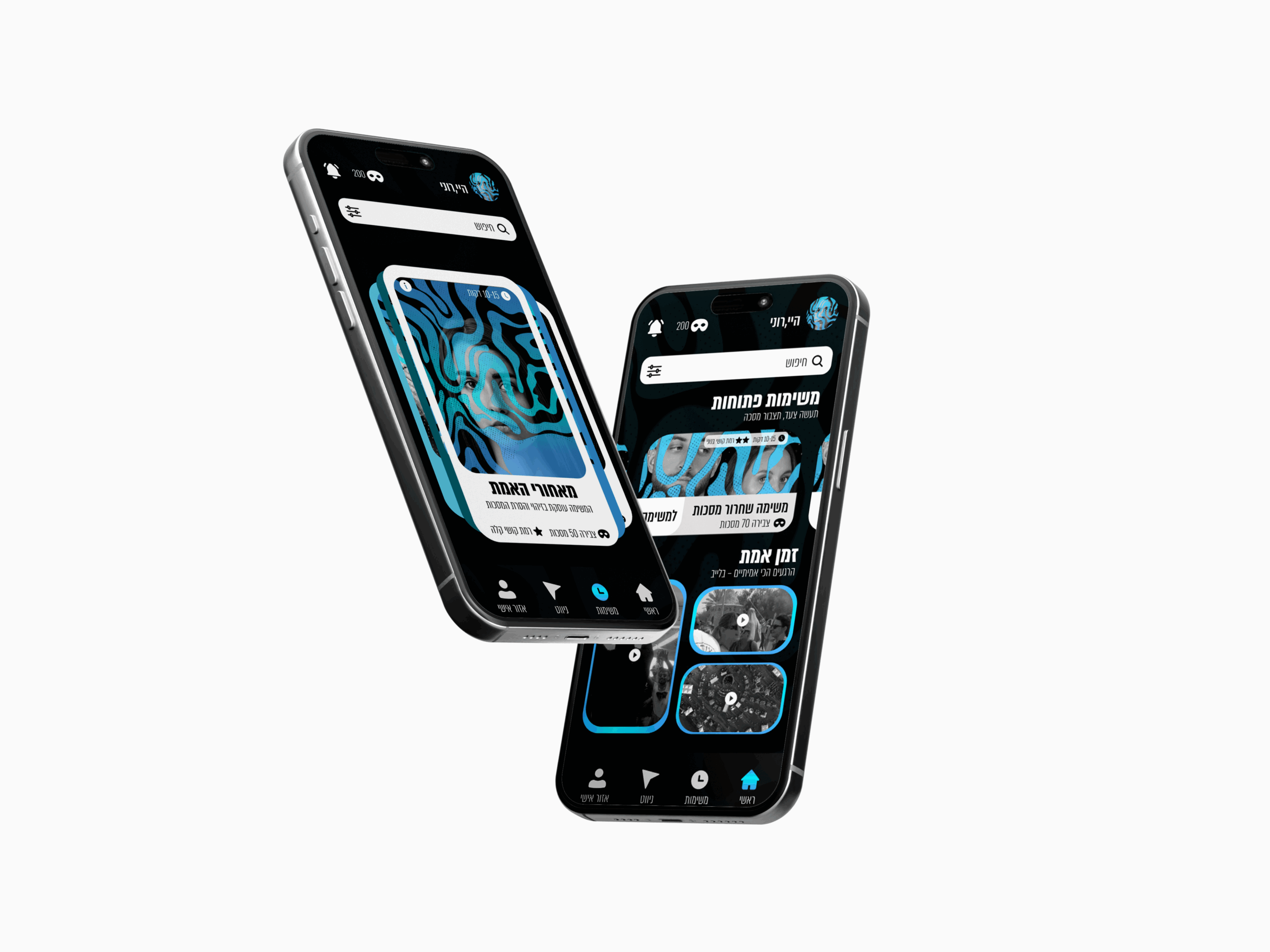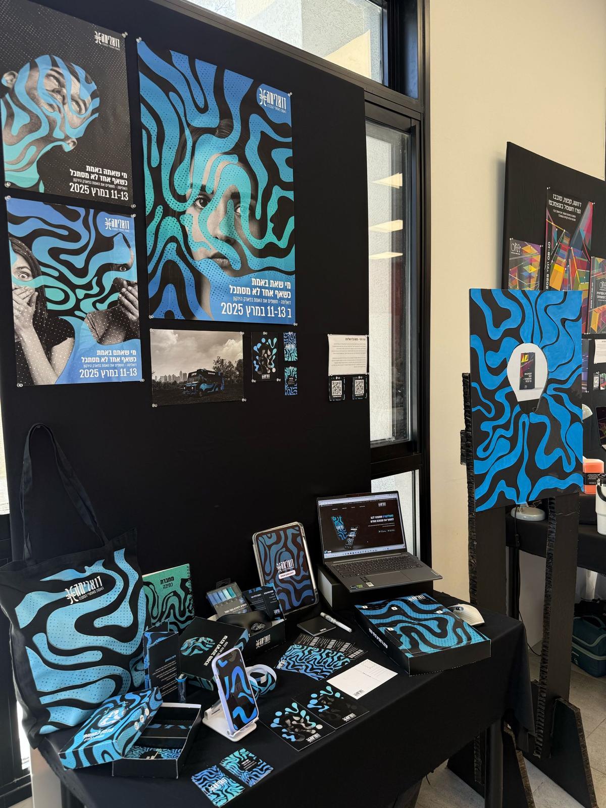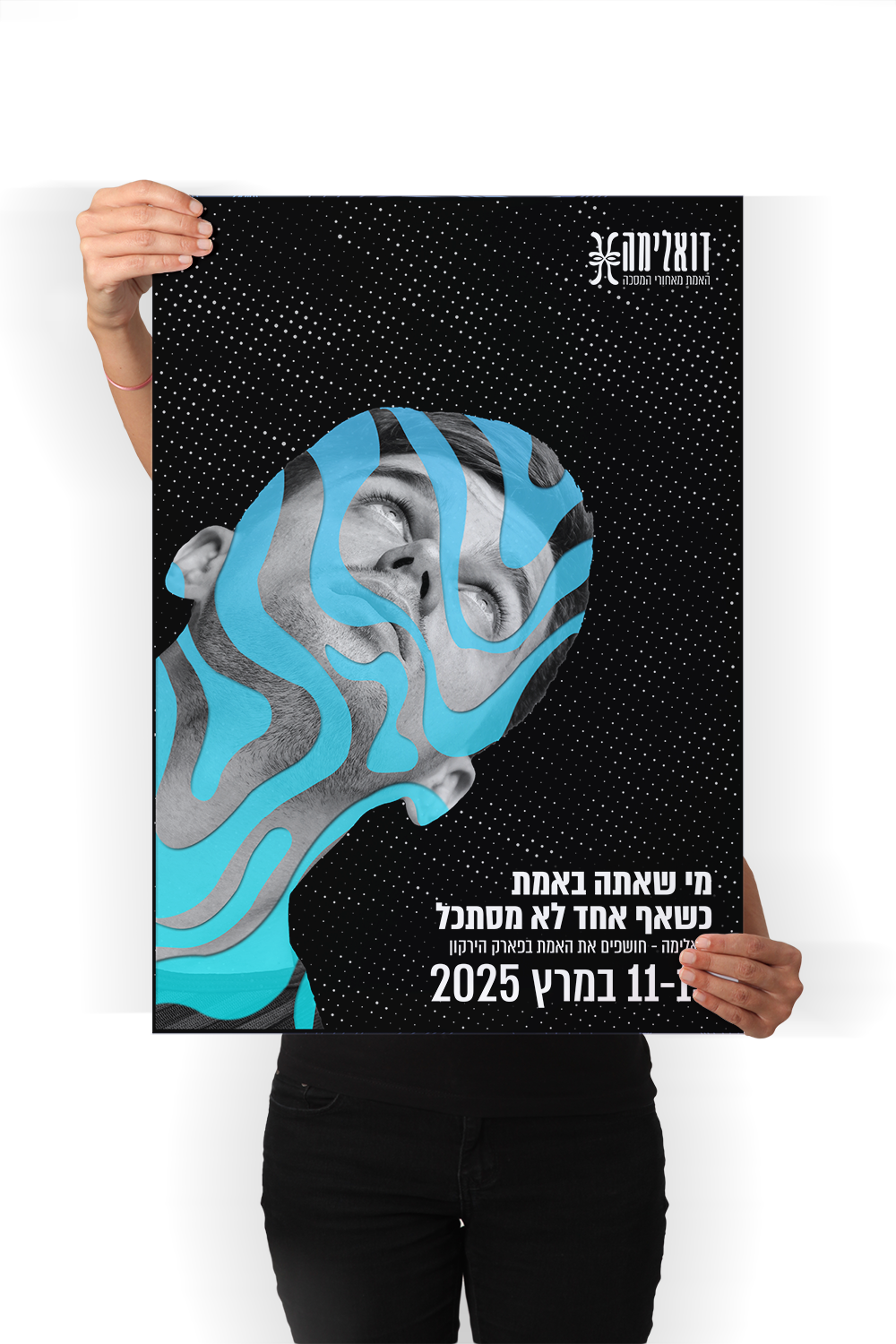השפה הגרפית מבטאת דואליות, תנועה וחיפוש עצמי.
